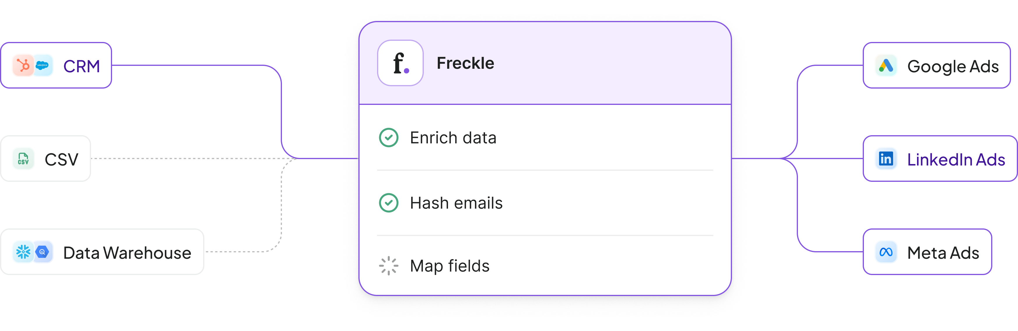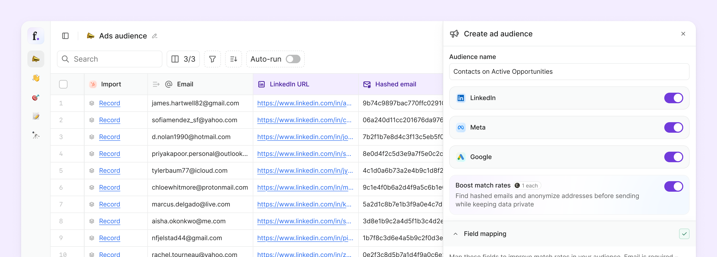 If you’re not using a CRM integration, you can still upload a list to Freckle, perform enrichments and retrieve hashed emails, and push it to your ad platforms of choice. Here, the audience is static and needs to be refreshed when your data changes.